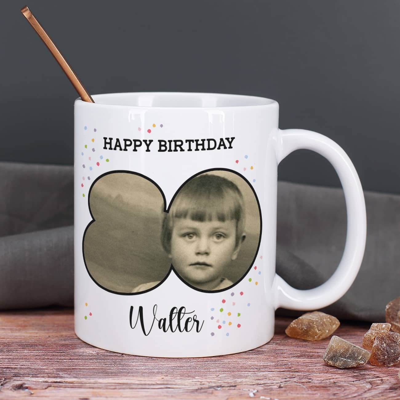 Die Geburtstagstasse mit Foto zum 80. Geburtstag wird dieses besondere Jubiläum perfekt einläuten! Überreichen Sie die schicke Fototasse als Geburtstagsgeschenk direkt am Frühstückstisch, damit der Tag direkt schön startet. Bedruckt wird die Geburtstagstasse mit einer Zahl 80, in die das Foto nach Ihrem wunsch eingesetzt wird. Sie können sogar ein Kinderfoto des Jubilar oder der Jubilarin verwenden. Zusätzlich drucken wir den Schriftzug "Happy Birthday" und einen Namen nach Wunsch auf. Mit einem tollen Fotogeschenk und personalisierte Geschenk wird der Kaffee am Morgen und der Tee am Nachmittag noch viel besser schmecken! Ein Geburtstagsgeschenk wie dieses kommt unübersehlich von Herzen und wird jedem Geburtstagskind eine große Freude machen.
