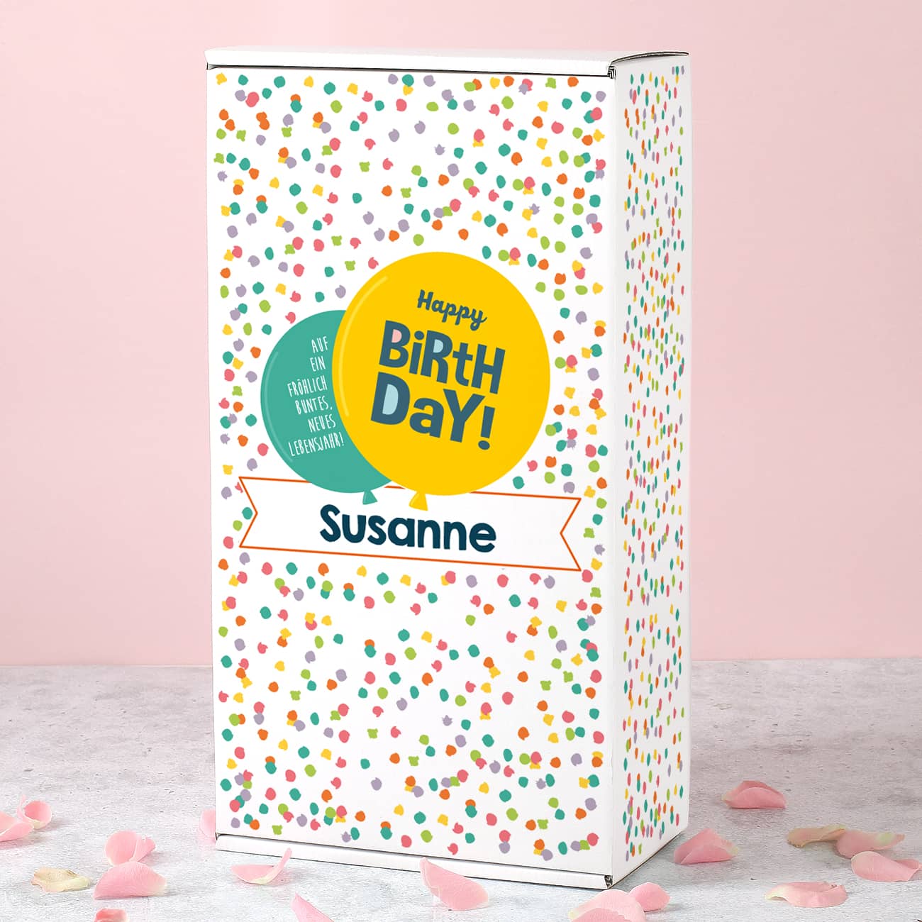 Abgerundet wird das Geschenk durch eine persönliche Geschenkverpackung. Der Deckel der weißen Box wird mit bunten Konfettischnipseln bedruckt. In der Mitte steht in zwei Luftballons zum einen "Happy Birthday" und zum anderen "Auf ein fröhlich buntes, neues Lebensjahr!". Darunter ist ein Banner platziert in dem ebenfalls Ihr Wunschname zu finden ist. Im Inneren der Verpackung befindet sich ein Inlay, damit auch beim Transport zum Geburtstagskind alles ganz bleibt.