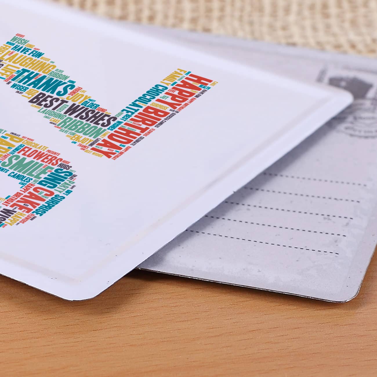 Diese Blechpostkarte wird mit einer großen bunten 70, bestehend aus vielen Wörtern, die zum Thema Geburtstag passen, und dem Wunschnamen bedruckt. Die Rückseite steht Ihnen zum selbstbeschreiben zur Verfügung.